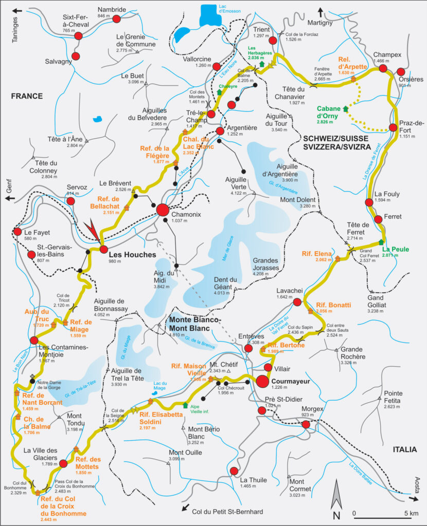 뚜르 드 몽블랑(Tour du Mont Blanc)은 프랑스 샤모니를 기점으로 이탈리아의 쿠르마에유(Courmayeur)와 스위스의 트리앙(Trient)을 거쳐 다시 샤모니로 돌아오는 약 165km의 원형 트레킹 코스로, 알프스를 대표하는 몽블랑(4,808m)을 중심에 두고 3개국을 넘나듭니다. 평균 해발 2,500m 안팎의 고개(passes) 10여 곳을 오르내리며 **누적 상승고도만 약 10,000m(10km)**에 달해 도전적이지만, 마을과 산장·대피소가 잘 갖춰져 있어 숙박·식사가 수월하고 일정을 7~11일가량으로 유연하게 조정할 수 있는 것이 장점입니다. 완주를 목표로 하는 종주자부터 가족 단위의 하이커까지 각자 체력과 시간에 맞게 구간을 선택할 수 있어, ‘알프스 트레킹의 교과서’이자 전 세계 트레커들이 꿈꾸는 버킷리스트 코스로 손꼽힙니다.