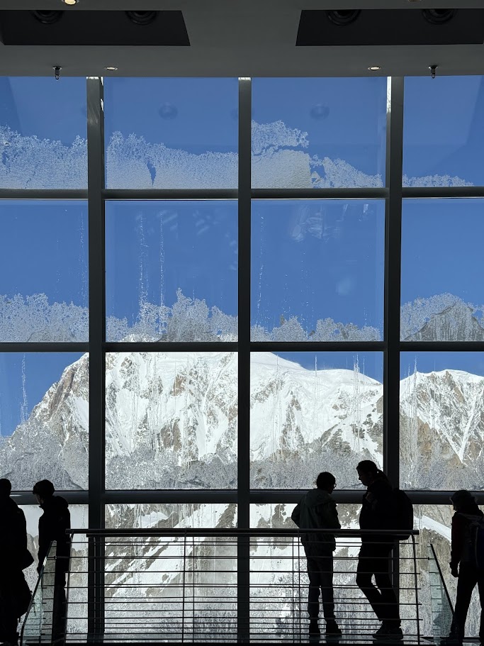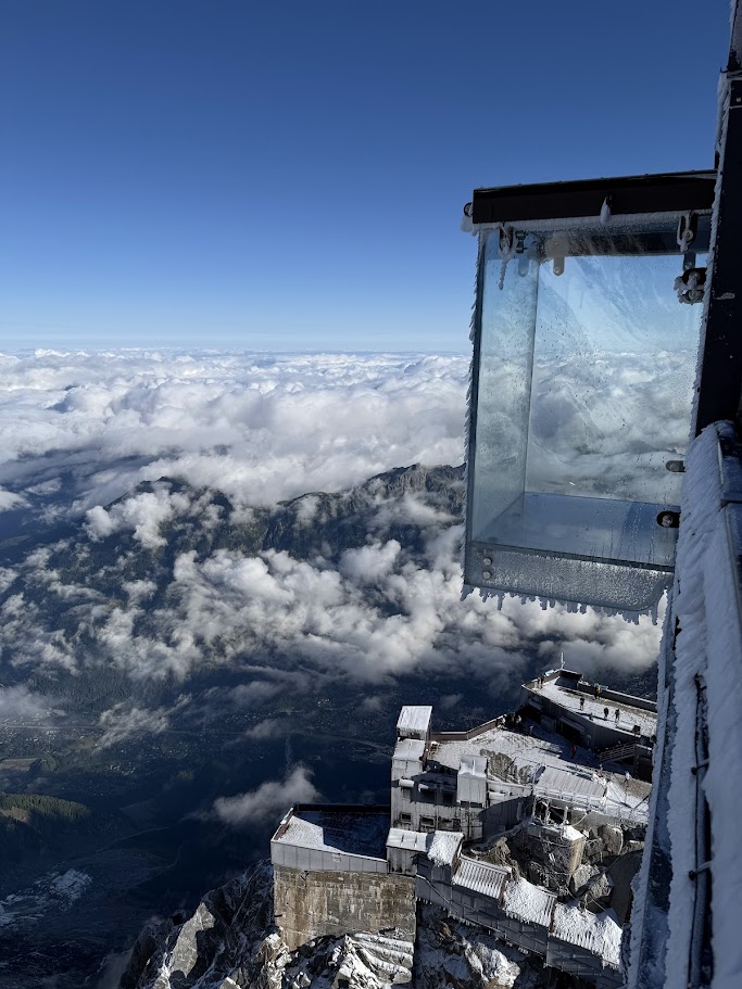 에귀디 미디 정상부에는 ‘Pas dans le Vide’라는 이름의, 발 아래까지 유리로 된 유리 박스 포토 스팟(일명 인투 더 스카이)이 있습니다. 입장료는 따로 없고 케이블카 티켓에 포함되어 있지만, 사진 한 번 찍으려고 줄이 꽤 길게 늘어서 있더군요. 우리는 오래 기다리는 대신, 바깥 테라스에서 탁 트인 풍경을 충분히 즐기는 걸로 만족했습니다. 유리 박스만큼의 스릴은 없지만, 몽블랑과 주변 봉우리들이 만들어 내는 풍경은 어디서 보든 압도적이었어요.