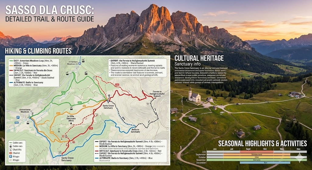- 추천 코스: La Crusc 성당(2,045m) → 아르멘타라 초원 → Ranch da André → Valgiarëi → Furnacia → 바디아 마을 (원점 회귀)