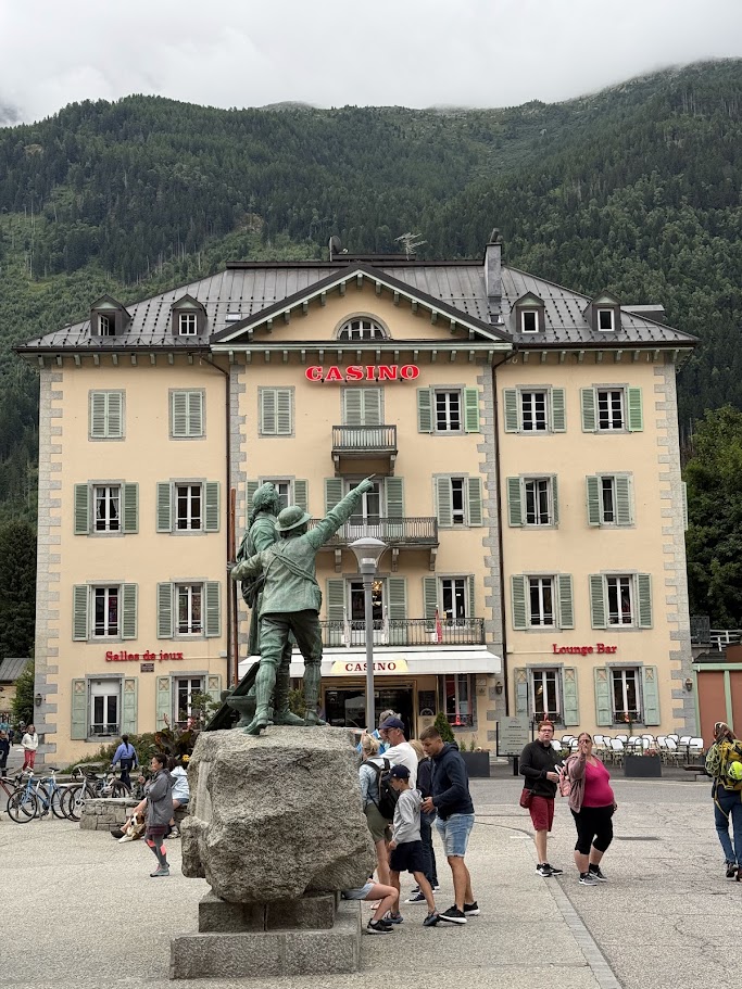 걷다 보니 샤모니의 상징인 ‘발마 광장(Place Balmat)’에 도착했습니다. 이곳에는 손가락으로 몽블랑 정상을 가리키는 두 남자의 동상이 서 있습니다. 바로 몽블랑을 처음으로 등정한 자크 발마(Jacques Balmat)와 그를 후원한 오라스 베네딕트 드 소쉬르(Horace-Bénédict de Saussure)입니다. 동상 뒤로는 고풍스러운 카지노(Casino Le Royal Chamonix) 건물이 떡하니 버티고 있고요. 확실히 우리가 머물던 조용한 레우슈보다는 훨씬 활기차고 북적이는, 명실상부한 알프스 관광의 중심지다웠습니다.