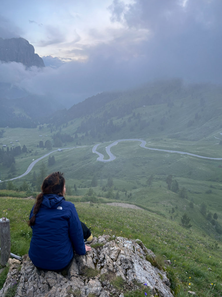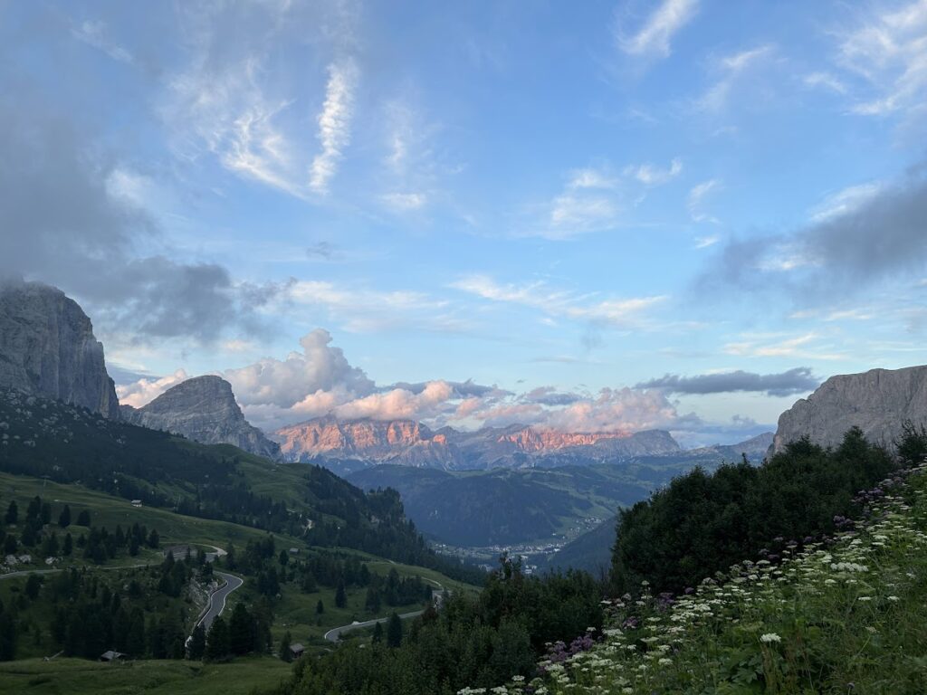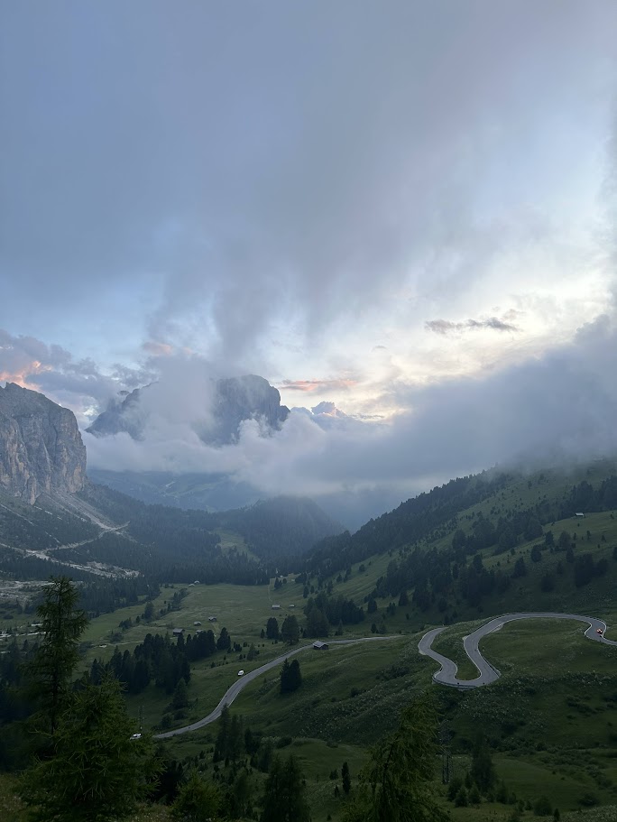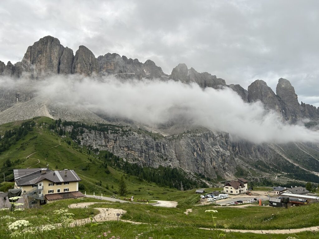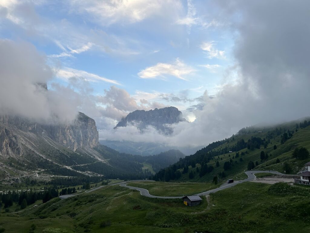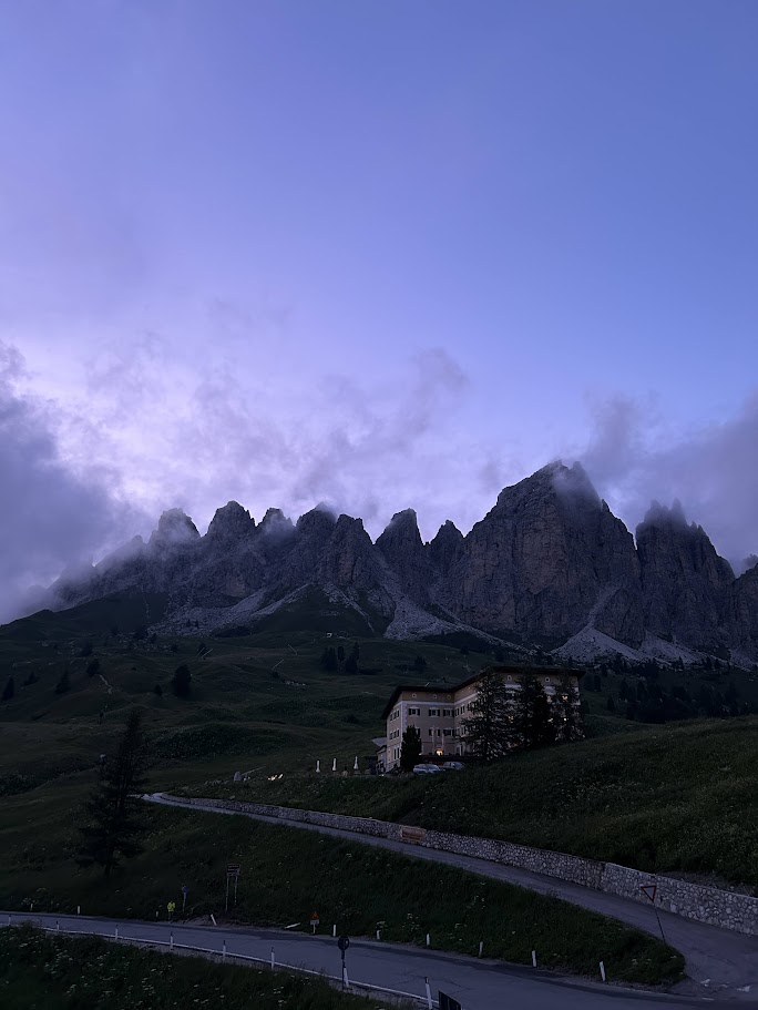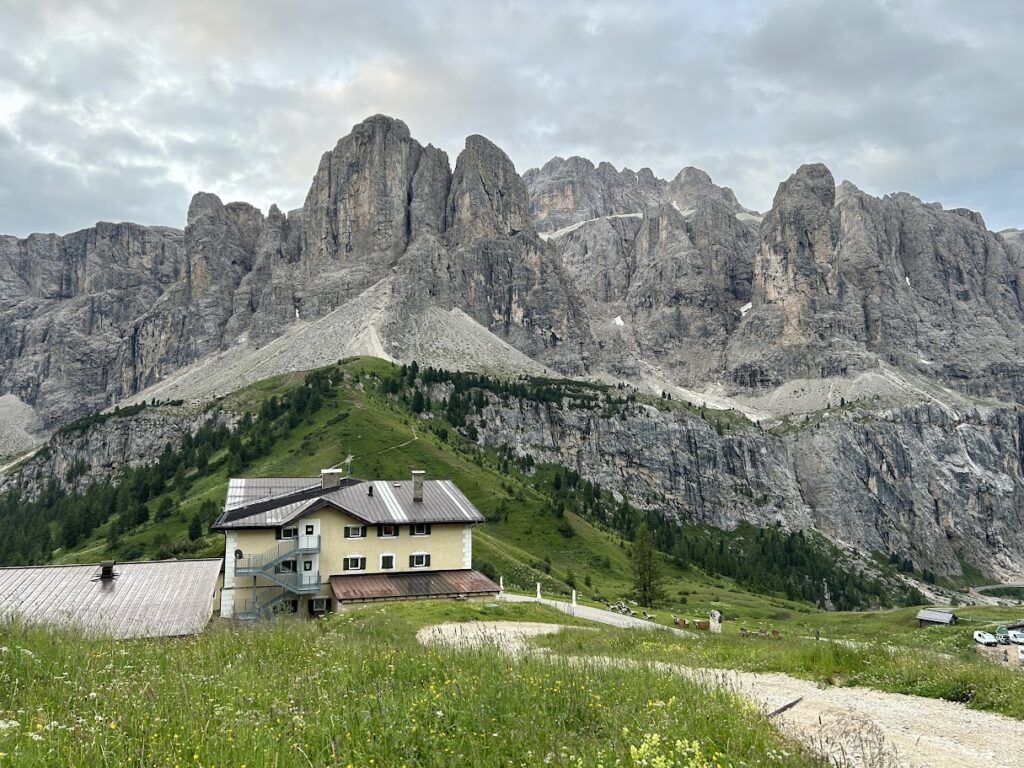 - 특징: 우리가 묵은 곳으로, 돌로미티에서 가장 수려한 경관을 자랑하는 고개 중 하나입니다. 날카로운 치르 봉우리와 거대한 셀라 성벽 사이를 통과하는 압도적인 개방감이 일품입니다.