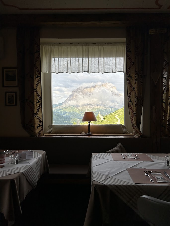 산책을 마치고 돌아온 호텔의 아침 식사 장소는 그야말로 환상적이었습니다. 식당의 넓은 통창은 마치 거대한 액자처럼 돌로미티의 풍경을 담아내고 있었습니다.