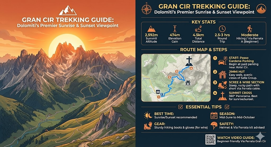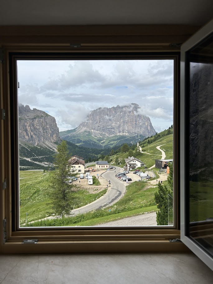 우리의 숙소인 호텔 치르(Hotel Cir)는 이 고갯마루 정점에 위치해 있어, 별도의 이동 없이도 객실과 테라스에서 돌로미티의 일출과 일몰을 모두 경험할 수 있는 최적의 입지를 갖추고 있습니다.