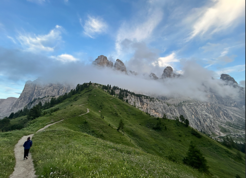 체크인을 마친 뒤 가벼운 차림으로 호텔 주변을 산책했습니다. 숙소 정면으로 보이는 셀라(Sella) 산군 쪽으로 조금 올라가보니, 마치 구름 위를 떠다니는 산처럼 보이는 환상적인 풍경이 펼쳐졌습니다.
