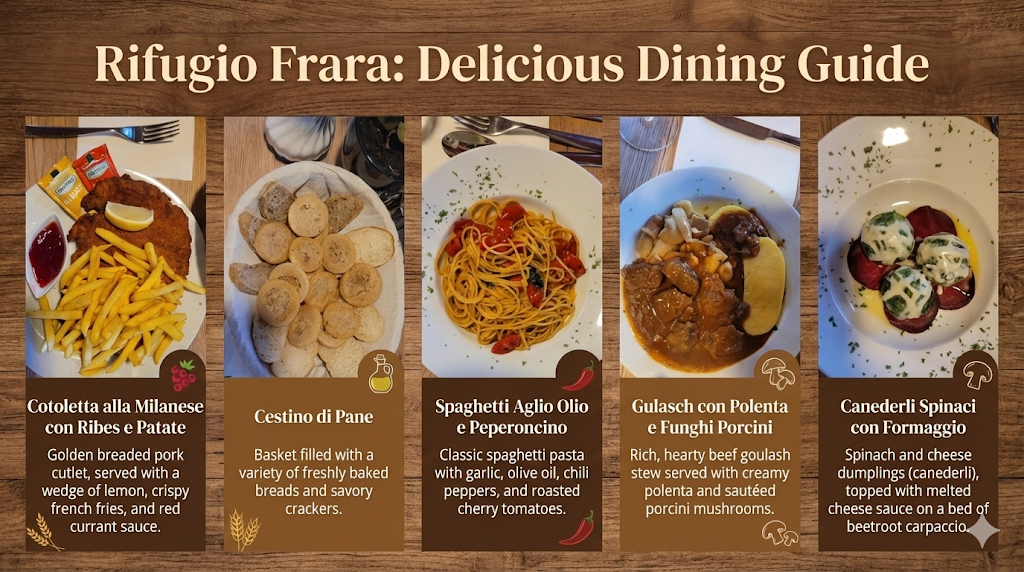 저녁 식사는 호텔 맞은편의 프라라 산장(Rifugio Frara)에서 해결했습니다 [cite: IMG_5880.JPG]. 굴라쉬와 폴렌타, 밀라노식 커틀릿(돈가스와 유사한 형태) 등은 시장기를 달래기에 충분했습니다.