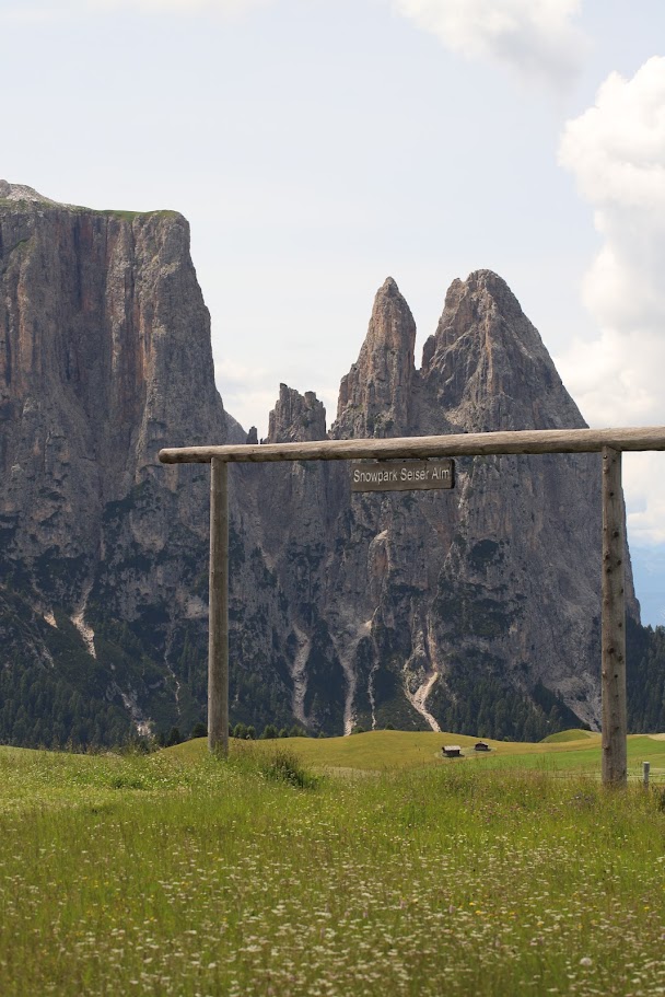 ‘Snowpark Seiser Alm’이라는 표지판인데, 지금은 푸른 초원 위에 덩그러니 서 있는 구조물이 낯설게 느껴지지만, 이곳은 겨울이 되면 이탈리아 최고의 스노우파크로 변신하여 스키어와 스노우보더들의 성지가 되는 곳입니다. 계절에 따라 완전히 다른 얼굴을 보여주는 알페디시우시의 이중적인 매력을 상징적으로 보여주는 듯했습니다.