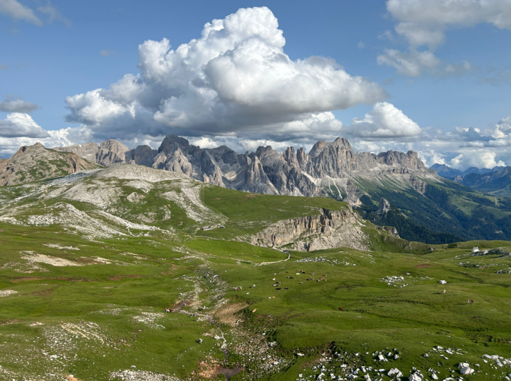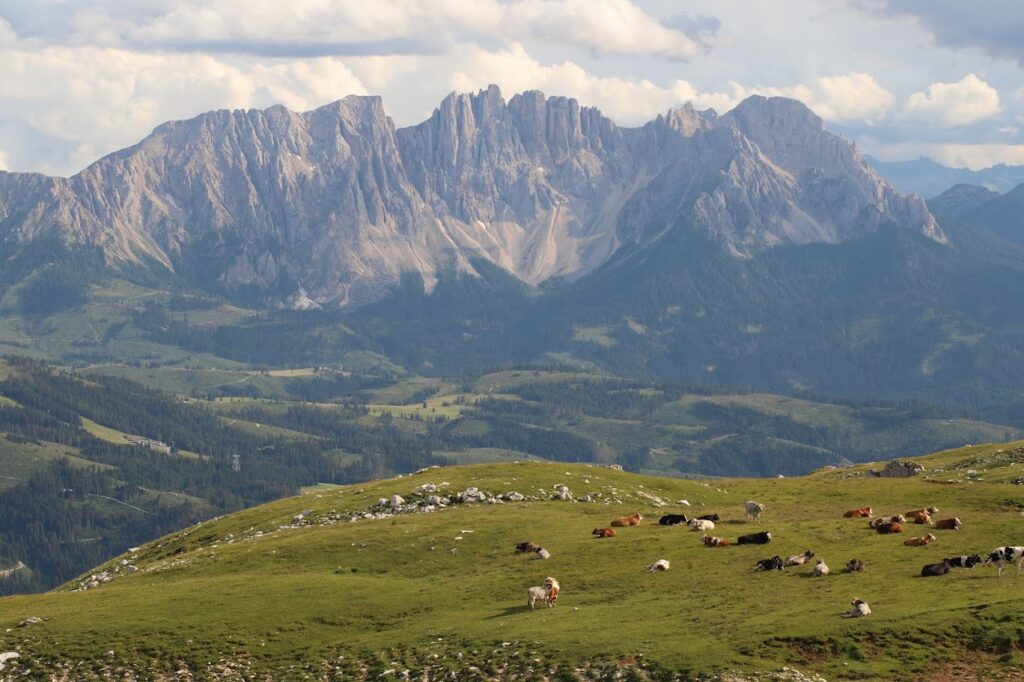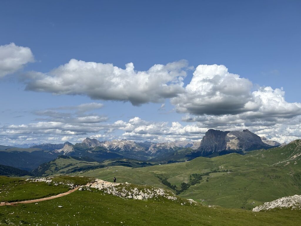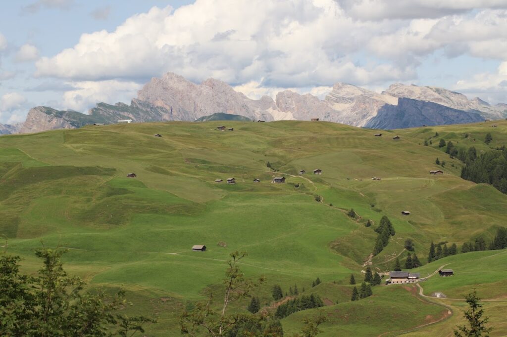 이곳은 단순히 넓은 초원이 아닙니다. 360도 어디를 둘러봐도 돌로미티의 걸작들이 병풍처럼 펼쳐져 있습니다. 동쪽으로는 웅장한 사쏘룽고(Sassolungo)와 사쏘피아토(Sassopiatto)가, 서쪽으로는 알페디시우시의 상징인 쉴리어(Sciliar/Schlern) 산군이 압도적인 존재감을 뽐냅니다. 남쪽 멀리로는 로젠가르텐(Rosengarten) 산군까지 조망할 수 있어, 그야말로 ‘돌로미티의 파노라마’를 한눈에 담을 수 있는 곳입니다.