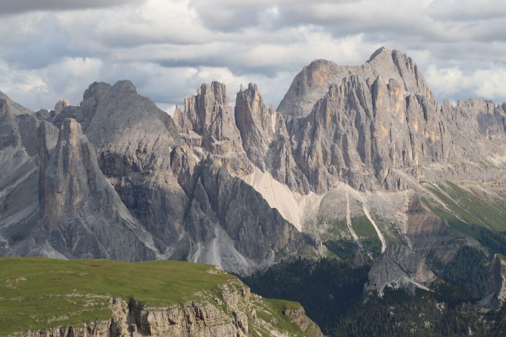 그리고 능선 너머 정면으로는 또 다른 거인, 로젠가르텐(Rosengarten/Catinaccio) 산군이 모습을 드러냈습니다. 독일어로 ‘장미 정원’이라는 뜻을 가진 이 산군은 이름처럼 낭만적인 전설을 품고 있습니다. 뾰족하게 솟은 암봉들이 마치 거대한 성벽처럼 펼쳐져 있는데, 해 질 녘이면 이 회색 바위들이 붉은 장미빛으로 물드는 ‘엔로사디라(Enrosadira)’ 현상의 중심지이기도 합니다.