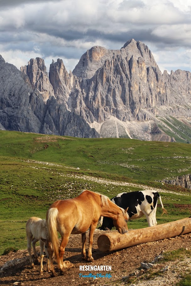 하지만 이 길을 걸었기에 알페디시우시의 진정한 주인, 사쏘룽고(Sassolungo)와 사쏘피아토(Sassopiatto) 형제를 정면에서 마주할 수 있었습니다. 이 두 봉우리는 알페디시우시 어디에서나 보이는 랜드마크지만, 이렇게 초원과 눈높이를 맞추며 다가갈 때 그 웅장함이 배가됩니다.