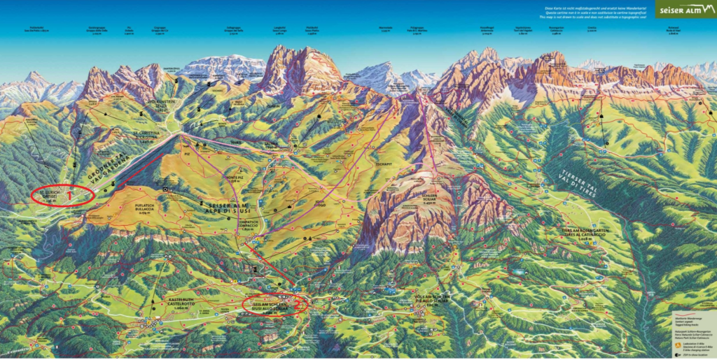 - 시우시(Siusi) 출발: Seiser Alm 곤돌라 이용 (서쪽 컴파치 진입)