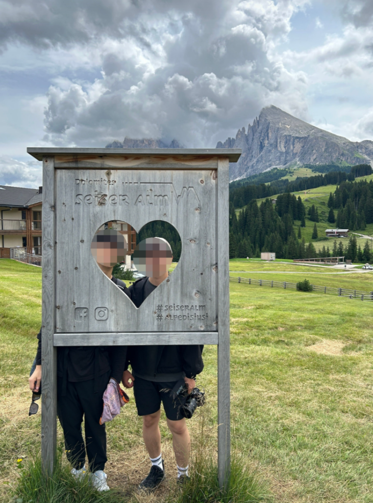 곤돌라에서 내리자마자 마주하는 풍경은 압도적입니다. 좌측으로는 뾰족한 사쏘룽고 형제들이, 우측으로는 쉴리어 산군이 시야를 꽉 채웁니다. 많은 사람들이 이곳 포토존에서 인증샷을 남깁니다.