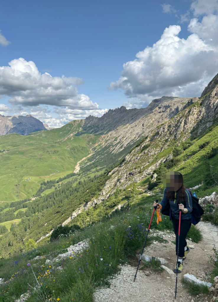결론부터 말하자면, 볼차노 산장까지 가는 것이 목표라면 이 구간은 리프트를 이용하거나 체력을 최대한 아끼시길 권합니다. 눈앞에 펼쳐지는 초원과 바위산의 조화는 훌륭했지만, 1시간 동안의 하산은 생각보다 무릎과 체력을 갉아먹습니다. 트레킹은 ‘선택과 집중’입니다. 보여지는 풍경이 비슷하다면, 에너지는 가장 힘든 구간을 위해 비축해야 합니다.