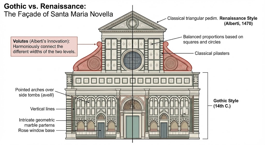 하단부의 고딕 양식과 상단부의 르네상스 양식을 자연스럽게 연결하기 위해 양옆에 ‘소용돌이 모양(Volutes)’ 장식을 넣었는데, 이는 이후 전 세계 성당 건축의 표준이 되었습니다. 수학적 비례가 주는 편안함이 느껴지나요?