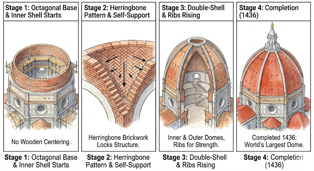 브루넬레스키는 벽돌을 ‘헤링본(물고기 뼈, Spina di Pesce)’ 모양으로 엇갈려 쌓는 획기적인 공법을 사용했습니다. 수평으로 쌓는 벽돌 사이에 수직 벽돌을 끼워 넣어 서로가 서로를 꽉 물게(Locking) 만드는 방식이죠. 덕분에 거푸집(지지대) 없이도 돔이 무너지지 않고 버틸 수 있었습니다. 이해를 돕기 위해 아래 인포그래픽을 참고해 보세요.