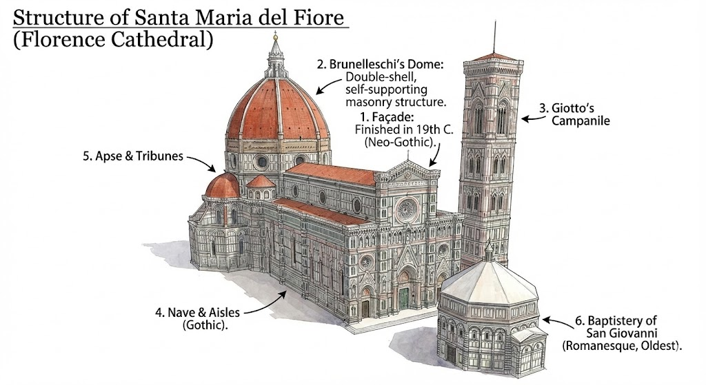 성당 앞에는 팔각형의 ‘산 조반니 세례당’이 있습니다. 두 건물 모두 흰색과 초록색 대리석 줄무늬로 비슷해 보이지만, 사실 세례당이 훨씬 형님(11세기 로마네스크 양식)입니다. 나중에 지은 대성당(고딕 양식)이 세례당과 어울리도록 일부러 비슷한 옷(대리석 패턴)을 입은 것이죠.