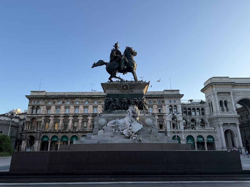 특히 밀라노가 속한 롬바르디아 지역을 오스트리아의 지배로부터 해방시킨 영웅이기에, 밀라노의 가장 중심인 대성당 광장에 그의 동상이, 그리고 그 옆에는 그의 이름을 딴 화려한 갤러리아가 자리 잡고 있는 것이겠지요. 새벽 비둘기 떼가 날아오르는 동상 앞에서 이탈리아 근대사의 무게를 잠시 느껴봅니다.