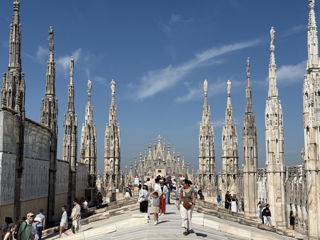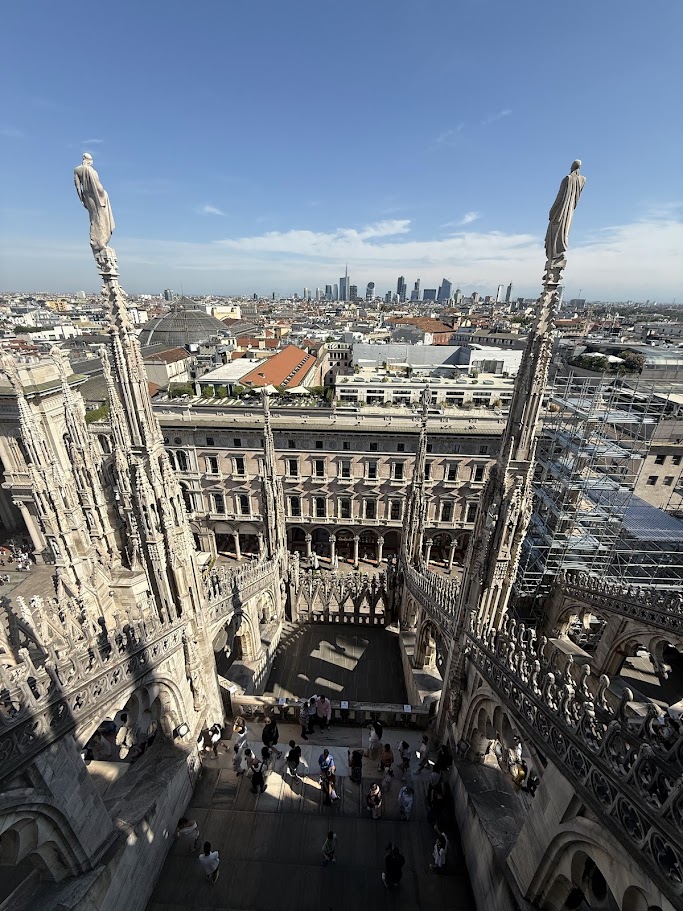 가장 높은 곳에서 밀라노를 내려다보는 황금 마돈나(Madonnina) 상 아래로, 과거의 유산과 현대적인 스카이라인이 공존하는 밀라노의 경제력이 한눈에 들어왔습니다. 옥상에서 이리저리 그 숨결을 느끼다 보니 1시간이 훌쩍 지나갔습니다.