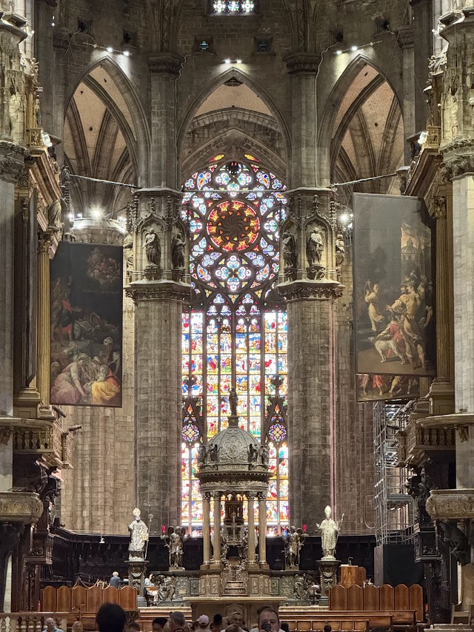이탈리아의 다른 대성당들과 비교해보자면, 시에나 대성당처럼 흑백 대리석의 화려한 장식으로 치장하지는 않았지만, 피렌체 대성당(두오모)의 수수한 내부보다는 훨씬 장엄했습니다. 화려함과 장엄함 사이, 그 절묘한 중간 지점에서 권위를 확보하고 있다는 인상을 받았습니다. 스테인드글라스를 통해 쏟아지는 빛은 이 거대한 돌 숲에 생명력을 불어넣고 있었습니다.