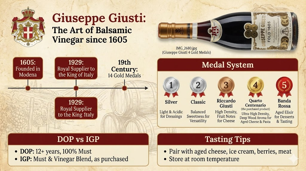 특별한 쇼핑 계획은 없었지만, 이탈리아 식문화의 정수라 할 수 있는 발사믹 식초가 눈에 들어왔습니다. “이탈리아에 왔으니 와인, 치즈, 그리고 발사믹은 제대로 된 걸 경험해보자.” 시음 끝에 선택한 것은 ‘쥬세페 쥬스티(Giuseppe Giusti)’의 골드메달 제품이었습니다. 붉은 인장이 찍힌 고풍스러운 라벨과 금색 메달 장식이 돋보이는 병은 400년 역사의 자부심을 보여주는 듯했습니다. 1605년부터 시작된 세계에서 가장 오래된 발사믹 제조사의 제품답게, 혀끝에 감기는 진득한 풍미는 이제껏 알던 식초와는 차원이 달랐습니다. 단순한 조미료가 아니라 시간과 정성이 빚어낸 ‘검은 액체 보석’을 산 기분이었습니다.
