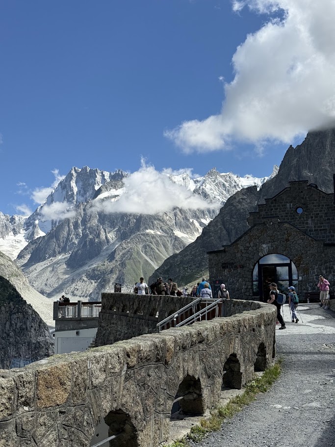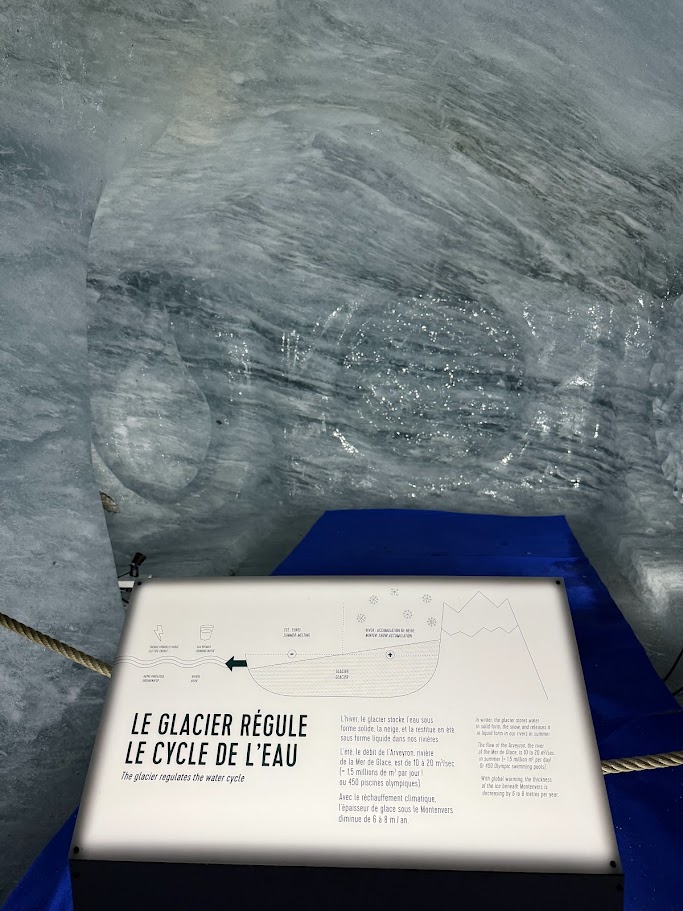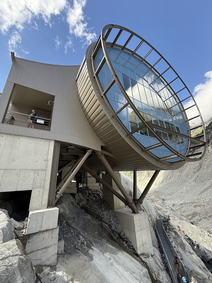 하지만 눈앞의 풍경은 경이로움과 동시에 안타까움을 자아냈습니다. 과거(19세기)에는 몽탕베르 역에서 계단 몇 개만 내려가도 빙하에 닿을 수 있었다고 합니다. 하지만 지금은 까마득하게 아래로 내려앉아, 하강 리프트(곤돌라)를 타고 한참을 내려가야만 겨우 빙하에 도달할 수 있을 정도로 많이 녹아버렸습니다. 기후 변화의 직격탄을 맞은 현장을 눈으로 확인하는 순간이었습니다.