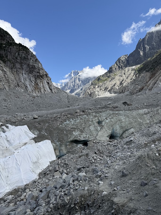 리프트를 타고 내려가면 실제 빙하 속을 뚫어 만든 ‘얼음 동굴(Grotte de Glace)’을 체험할 수 있습니다. 내려가는 길에 본 빙하의 표면은 하얀 얼음 대신 거친 바위와 자갈들로 뒤덮여 있었습니다. 이 역시 기후 변화로 빙하가 녹으면서 주변 산의 돌들이 쓸려 내려와 빙하 위를 덮어버렸기 때문이라고 합니다. (전문 용어로 ‘모레인’이라고 하죠.) 한쪽에는 하얀색 특수 천(방수포)을 넓게 덮어놓은 모습도 보였는데, 햇빛을 반사해 빙하가 녹는 속도를 그나마 늦춰보려는 처절한 노력의 흔적이라고 합니다.
