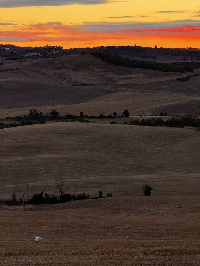 7월 말의 밀밭은 황금빛 수확을 끝내고 대지의 민낯을 드러내고 있었습니다. 석양 빛을 받은 갈색의 밀 그루터기들이 바람에 일렁이는 모습은 마치 거대한 벨벳 카펫을 깔아놓은 듯 부드러웠습니다. 이 척박한 땅에서 자라나 우리의 파스타가 되는 밀의 생명력이 노을 아래서 더욱 경건하게 다가왔습니다.