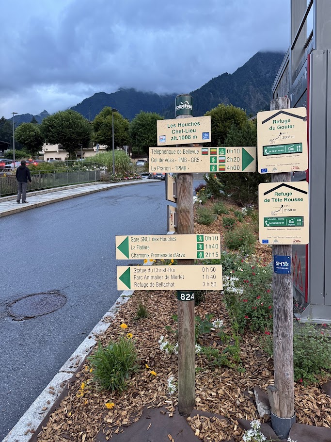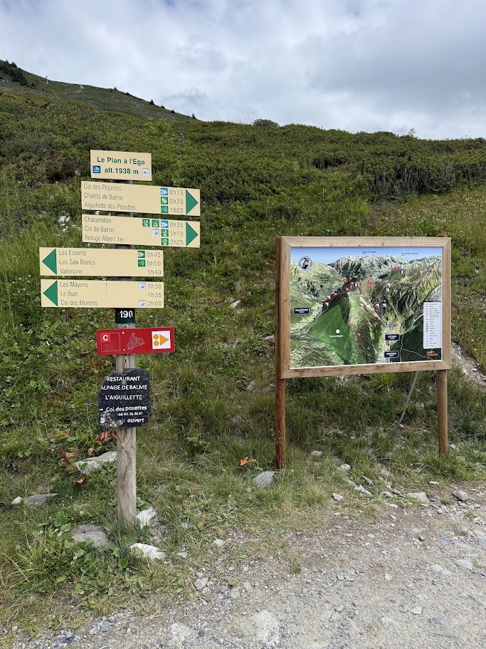 곤돌라에서 내린 곳은 ‘플랑 아 레가(Plan à l’Ega, 1,938m)’. 지도를 보니 이곳은 프랑스 땅이지만, 능선 하나만 넘으면 바로 스위스입니다. 표지판을 보니 아까 우리가 오전에 있었던 ‘콜 드 발므(Col de Balme)’까지 도보로 1시간 15분이면 갈 수 있다고 나오네요. 오전에는 맑았던 하늘에 어느새 먹구름이 잔뜩 끼었습니다.